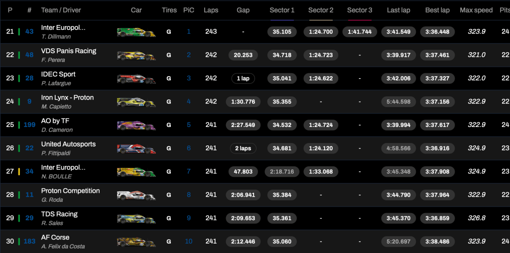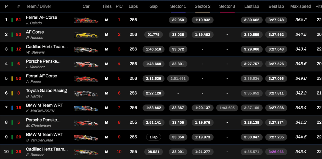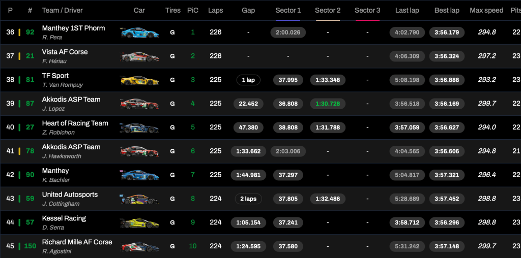 8h10 : Les Ferrari #51 et #83 sont pénalisés d’un Drive Through pour des infractions sous drapeau jaune. La Porsche #92 / Manthey 1st Phorm, leader en LMGT3, écope de la même pénalité pour la même raison.