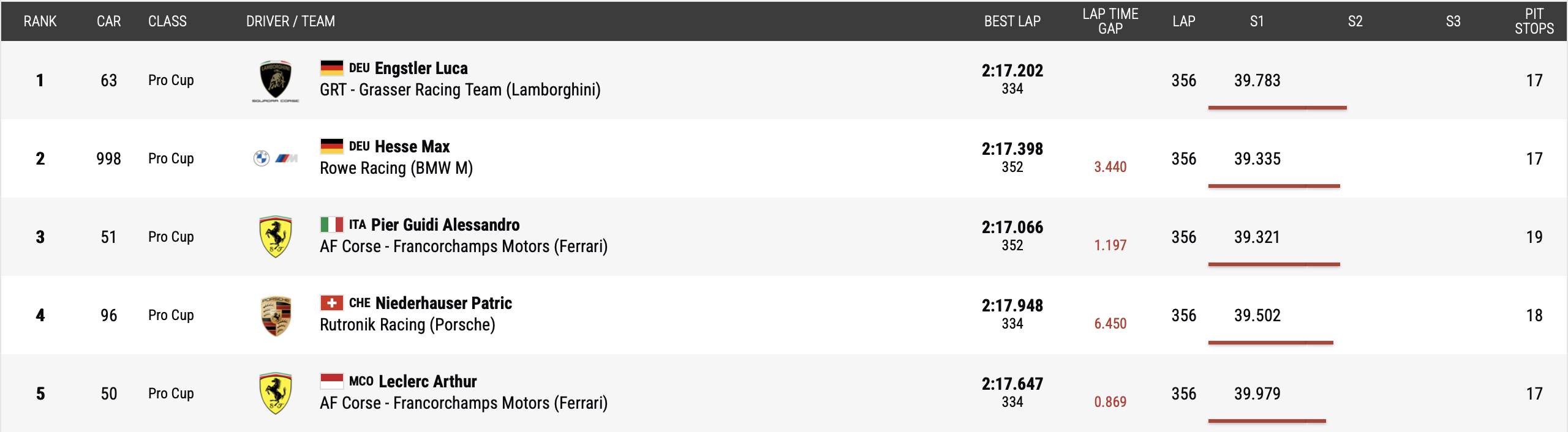 À noter la remontée fantastique de la Ferrari #51 / AF Corse – Francorchamps Motors, qui se retrouve 3e, juste devant la Porsche #96 / Rutronik Racing et la voiture soeur, la #50, 5e aux mains d’Arthur Leclerc.