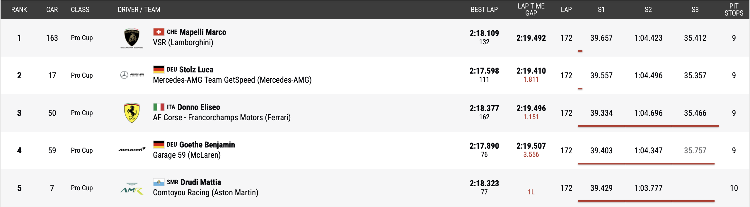 Quatre abandons sont à noter en catégorie Pro : les Porsche #22 / Schumacher CLRT, #18 / Dinamic GT et #911 / Pure Rxcing ainsi que la Mercedes #9 / Boutsen VDS.